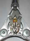 Perhaps the most unique component on the new C-Record gruppo (released in 1986) was the Delta brakeset, named for the shape of the housing covering the complex inner mechanism. Inside the housing was an articulated parallelogram mechanism that moved the brake shoes toward the rim by expanding outward and pushing one the upper portion of the brake arms. (Note: Although Delta brakes were first sold in 1986, they were originally shown to the public in 1984--for about an hour. Prototype Deltas were unveiled at a trade show that year, but were quickly taken down and removed from public viewing.) According to one account, only three sets of prototypes were made; two remain in private hands, the third is owned by Campagnolo. The Delta brakeset (later offered in both the C-Record and Croce d'Aune gruppos) offered--in theory--the great stopping power offered by the mechanical advantage of the internal mechanism. (Read our road test below) In practice, the first year's production run was a disaster--the cable clamping mechanism would fail, and the brakes would of course stop working! (As a replacement while this glitch was solved, Campagnolo introduced the "Cobalto" brakeset, which was basically a Super Record brakeset with a blue stone set in the recess of a mounting nut swapped out from the lower-priced Triomphe brakes. The Cobalto brakeset ended up hanging around for several years and remains a prized collectible piece.) Regardless of their inauspicious beginnings, the Deltas were a marvel to behold. Pick up a pair, and you'll find careful hand polishing in places where all that hard work is almost impossible to see. The underside of the brake body--the part that faces the tire--is polished, as are the insides of the brake arms. It's an amazing piece of workmanship that is not matched by even the Record groupset of today, and it puts to shame the finish of virtually every modern Campy gruppo. See the photos below for closeups. Updated 1-17-01--Reader webmaster@campyonly.com added to our Delta timeline . . . Not counting Croce d'Aune, there were 5 variations of the Delta. The first (recalled) lacked stainless guts ... they corroded quickly and were withdrawn. The second had knurled adjustments and adjustable mechanical advantage levers. The third went to the conical adjusters and slightly improved mech advantage. The fourth went to black rubber trim (and I think the availability of Ergo ... standard levers lost the adjustment and dual routing option). The fifth with yet again more mechanical advantage (and definitely the Ergo option, standard levers were no longer adjustable). Around version 4 or 5 they introduced a second set of thicker orbital spacers so you could run narrow rims. (See the photos below for examples of early (CDA) and later linkages)They were difficult to adjust ... God help you if you lost the 3.5 allen wrench. I manufactured a tool for final cable adjustment. Stopping power was fair, but easily modulated. I can lock the brakes, but it takes more effort than my dual pivots. Worn out pads can create problems ... you can run out of brake. They're heavy. They're beautiful. C-Record wasn't particularly light, but it had the some stunning pieces ... no Crank comes close to the lines of a C-Record. One other interesting aspect of the these brakes--indicative of Campagnolo's tradition-bound decisions of the day--was the brake levers. For the C-Record group, Campagnolo switched from gum rubber lever hoods to white rubber, and changed the design of the levers from perforations to diagonal grooves. But even though aero brake cable routing was becoming the rage, Campagnolo decided to let the user decide whether to have the cables erupt from the tops of the levers in non-aero style or go under the bar tape. In fact, these levers even allow you to run the brake cable along the front or back of the bars--quite a range of options. Delta brakes and the C-Record group lasted only a few years. Campagnolo eventually revamped their component line, introducing a working indexing system and the new Record, Chorus, and other groups. Deltas, however, remain a striking addition to even a modern Campy-equipped machine.